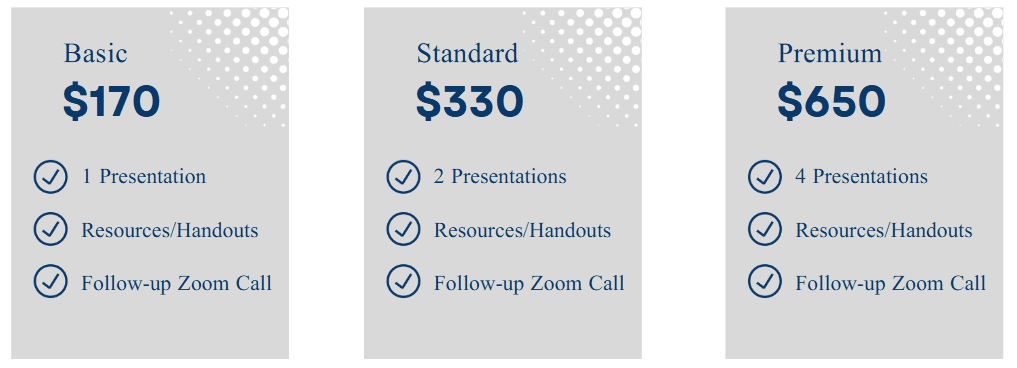 All packages include a complimentary parent talk. Participation is highly encouraged so the conversations can continue at home. This can be offered in person or virtually and can be done on a week night or weekend.